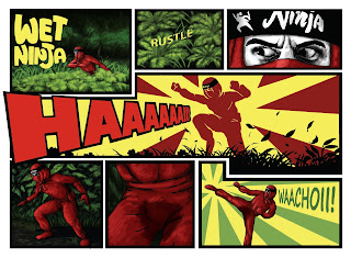 Hello all, this was for the same friend of mine that wants all the weird comics. This time he basically specified that there be a ninja in it and that he wets himself in the end frame. I initially had a velociraptor in there, but he didn't want it so off it went. That's the way the cookie crumbles.